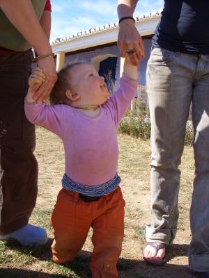 madita hat ihre ersten schritte getan, drei am stueck und sie war wirklich ganz stolz...und ich natuerlich auch! schon verrueckt wie das so alles passiert. ansonsten wird sie hier mit liebe ueberschuettet, jeder knutscht sie, jeder drueckt sie und jeder laeuft mit ihr kilometer durch den garten...sie geniesst es im mittelpunkt zu sein, spielt den clown beim essen, so dass immer gelacht wird.